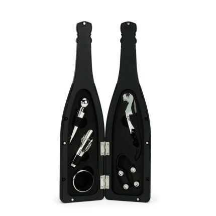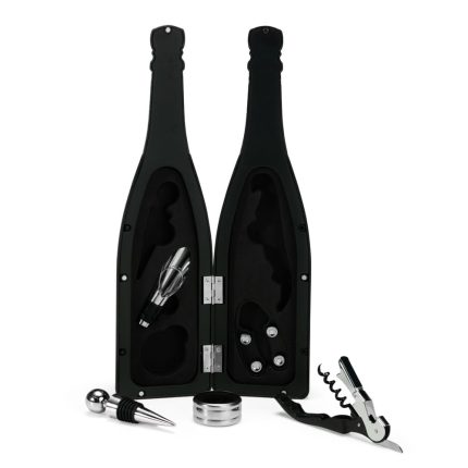 Descrição: Kit vinho com cinco peças dispostas em um estojo no formato de garrafa, fechamento imantado e interior com berço em