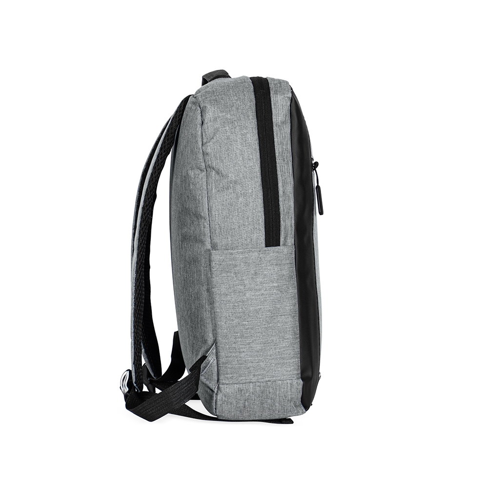 Descrição: Mochila confeccionada em poliéster 300D resistente à água, com detalhes em couro sintético, fechamento em zíper e capacidade para até 15 litros. Possui compartimento principal com bolsos em diferentes tamanhos e divisória para notebooks de até 15.6 polegadas. Dispõe ainda de compartimento frontal com fechamento em zíper e faixa reflexiva, além de bolso lateral aberto e adaptador USB externo.