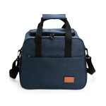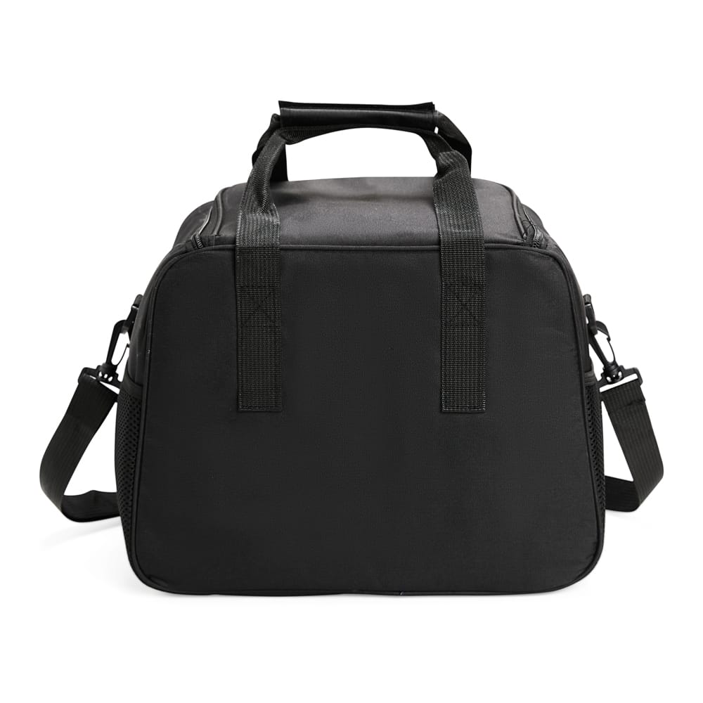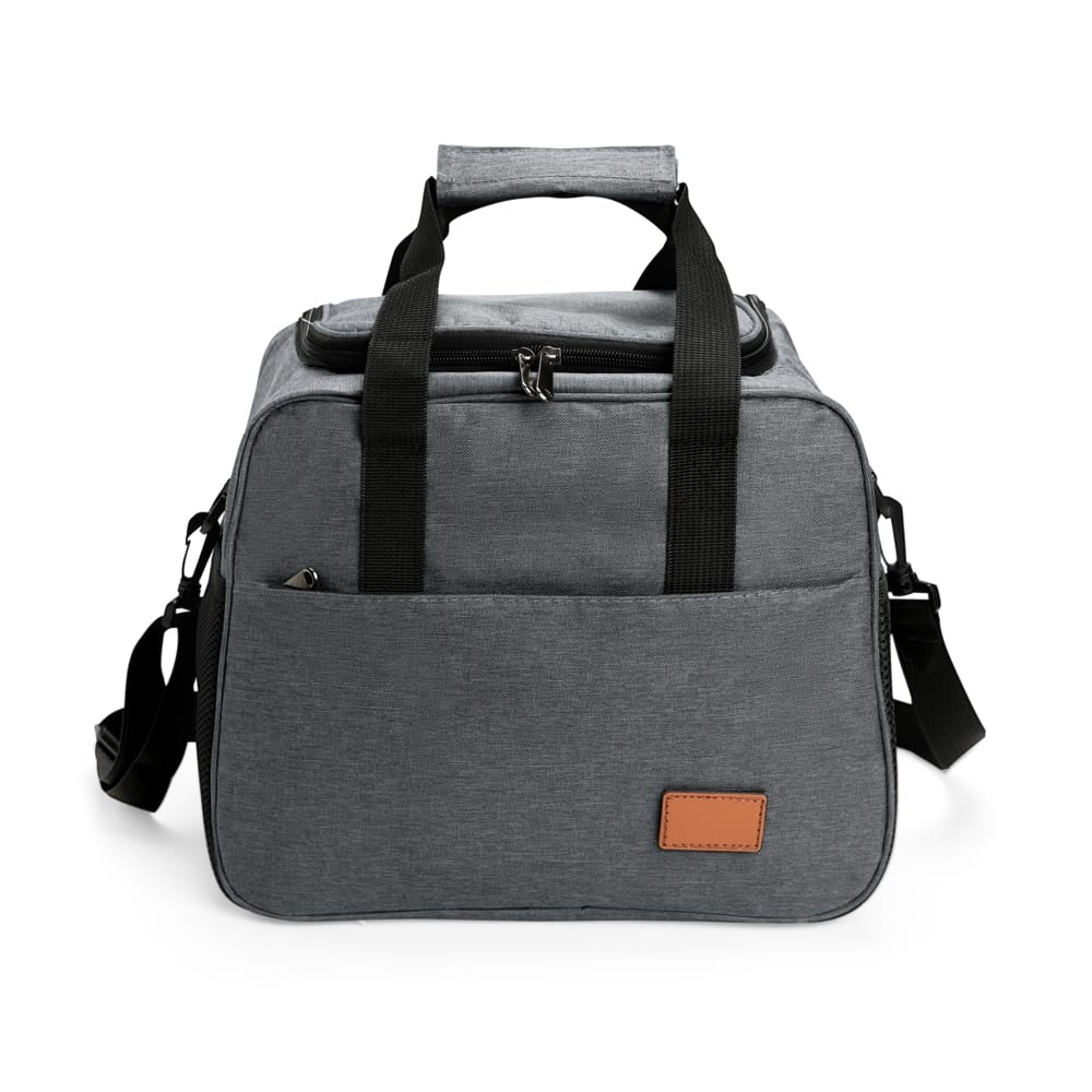 Descrição: Bolsa térmica confeccionada em Oxford com fechamento em zíper e capacidade de até 22 litros. O compartimento interno possui revestimento térmico em PEVA. Conta com bolso frontal de zíper com plaquinha de couro sintético fixada com velcro, além de um par de bolsos laterais em tela de tecido respirável com elástico. Apresenta ainda duas alças de mão com suporte de juntura e alça transversal regulável e removível, com mosquetões para encaixe nas fivelas laterais.