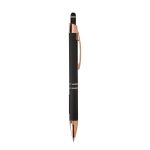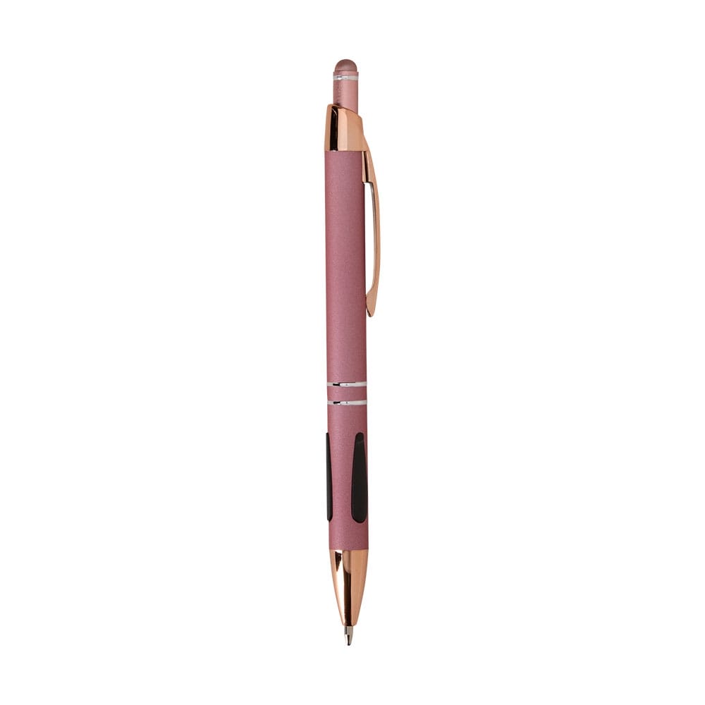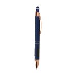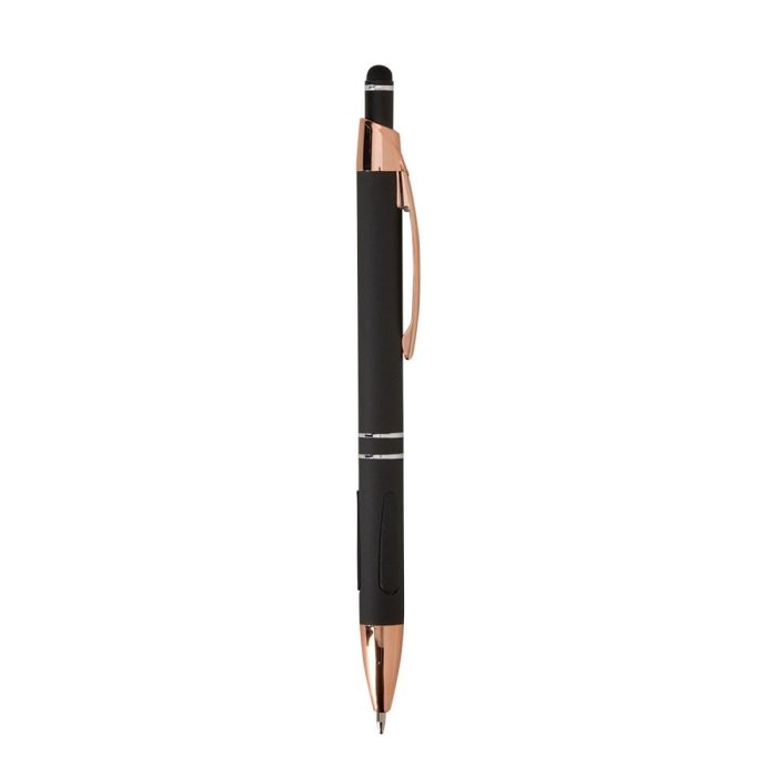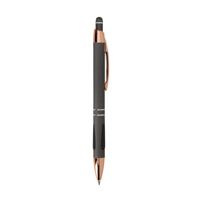 Descrição: Caneta em metal com detalhes emborrachados, carga esferográfica azul de 1.0mm e acionamento por clique com acabamento emborrachado que permite seu uso como uma caneta touch para interação com dispositivos de tela sensível ao toque.