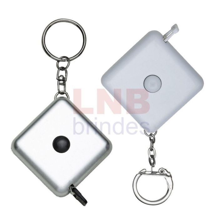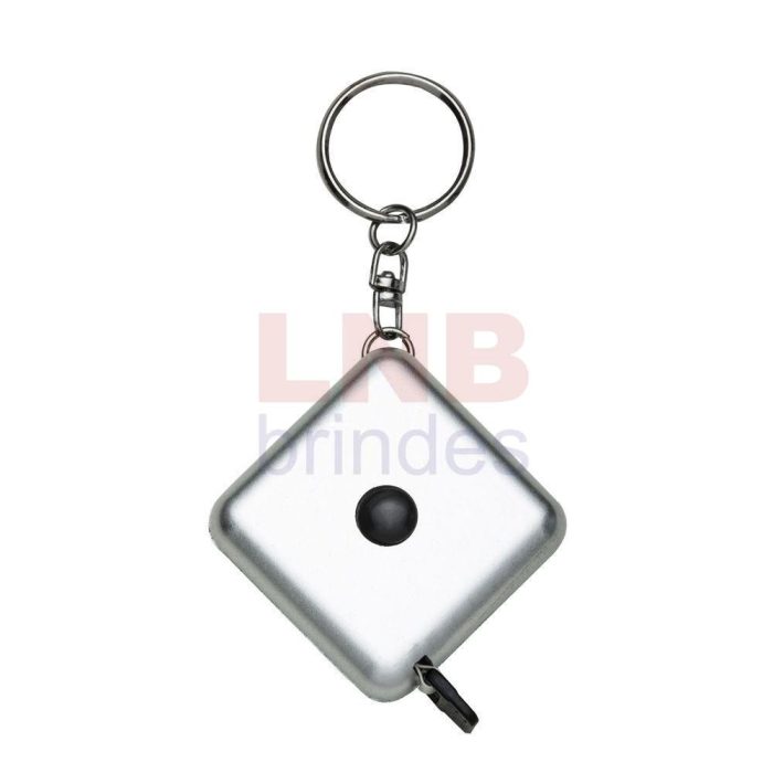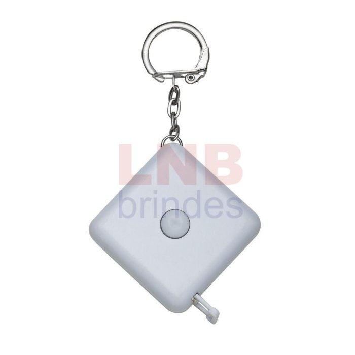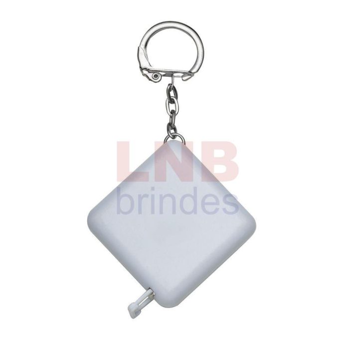 Fita métrica de 1 metro em plástico quadrangular, frente lisa e verso com botão(trava) preto. Acompanha chaveiro.