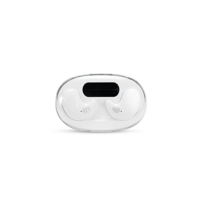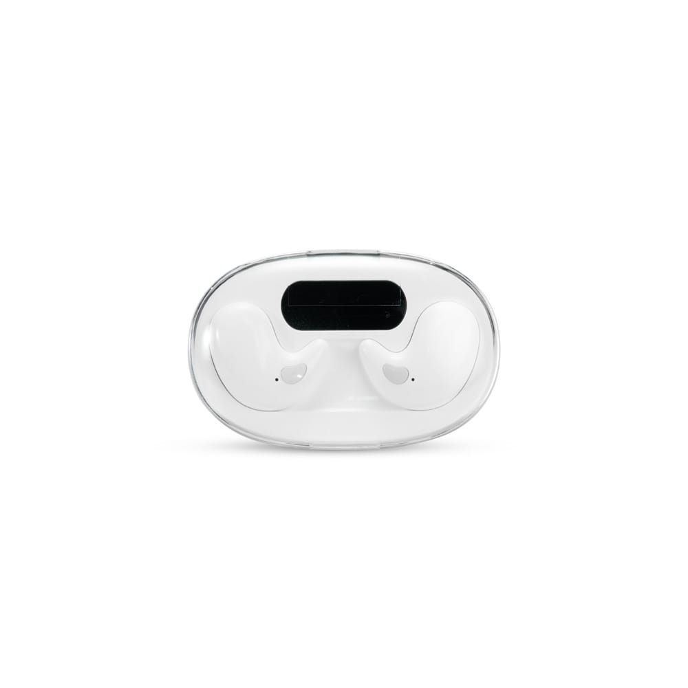 Descrição: Fones de ouvido intra-auriculares sem fio, com estrutura leve e compacta em plástico e conexão via Bluetooth 5.3, garantindo estabilidade durante o uso. Possui estojo de carregamento com display de LED para visualizar o nível de carga. Acompanha cabo USB-C.