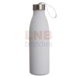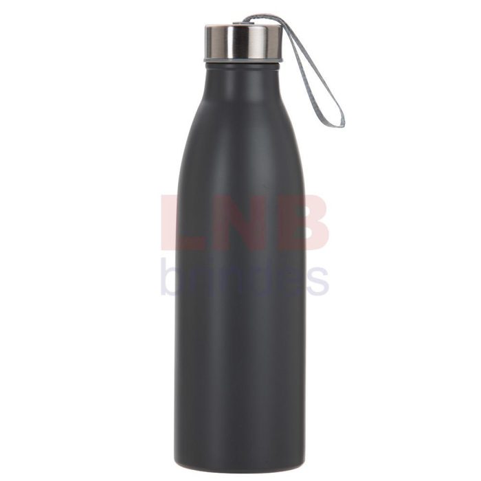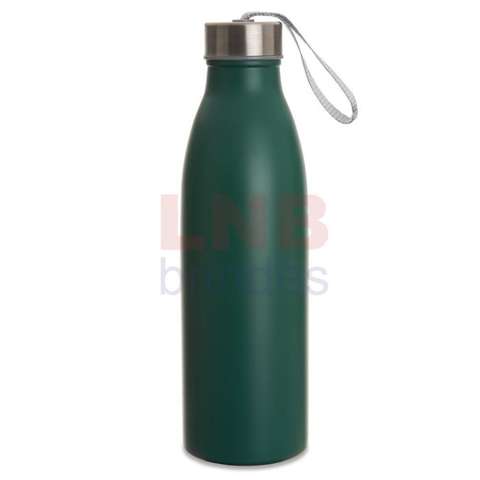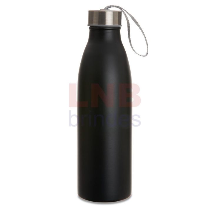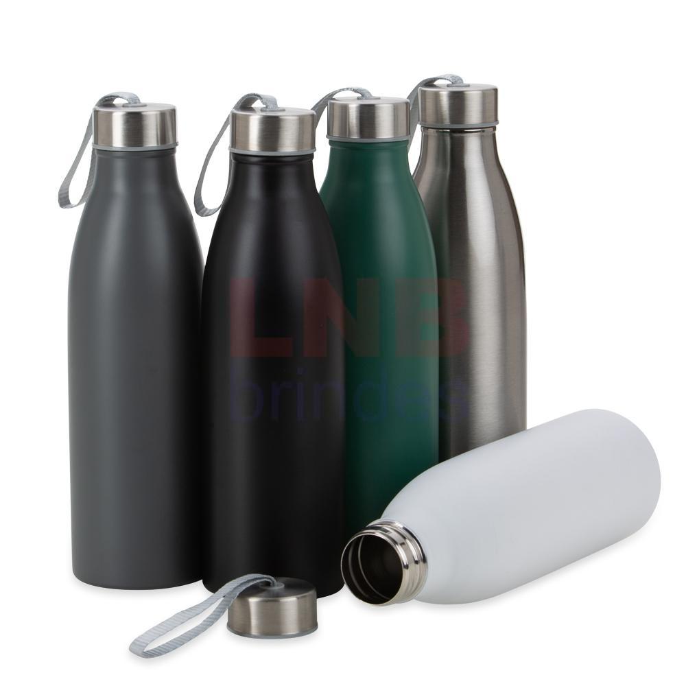 Garrafa de inox 750ml com tampa rosqueável e alça de nylon embutida.