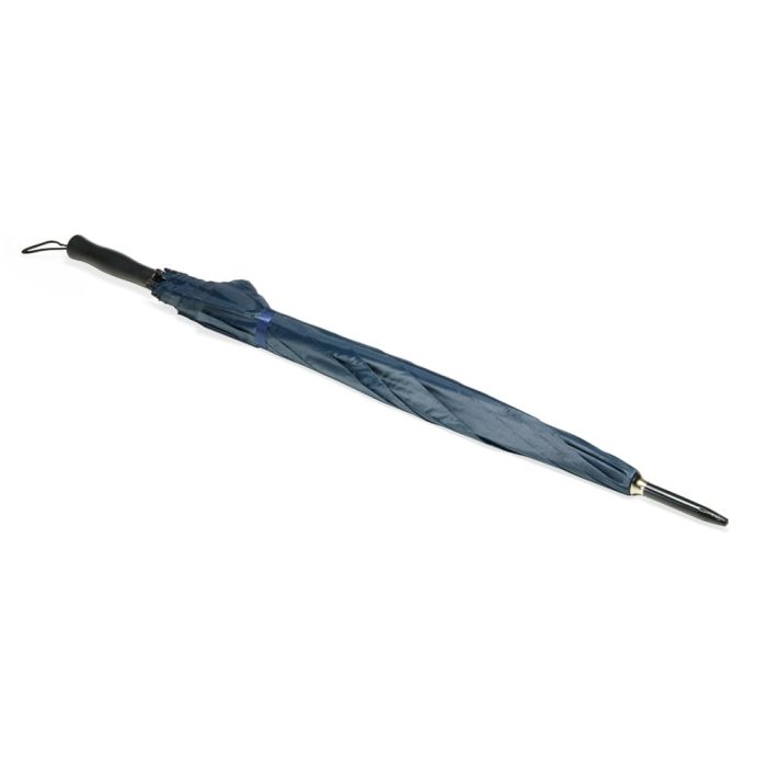 Descrição: Guarda-chuva em poliéster com abertura automática, estrutura metálica com oito varetas e pegador em plástico com alça de nylon fixa na extremidade.