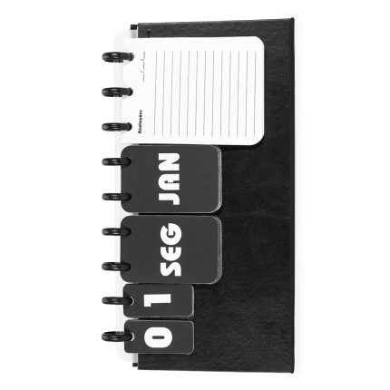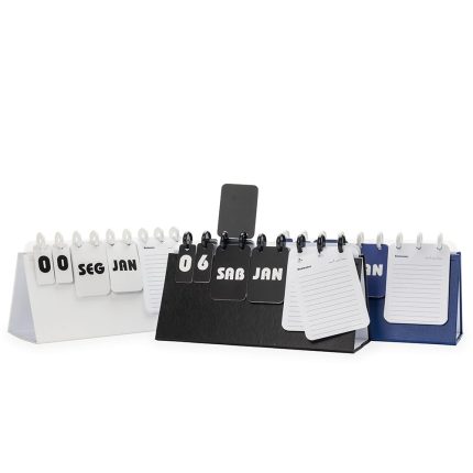 Descrição: Calendário permanente de mesa com base em percalux e encadernação em discos plásticos reposicionáveis. Inclui fichas para marcação dos dias