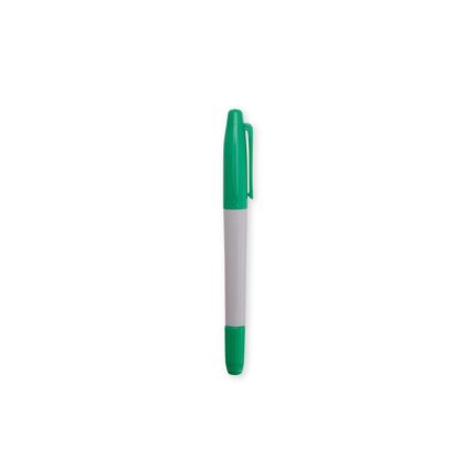 Descrição: Caneta marcadora plástica com duas pontas em formatos diferentes: uma fina e outra tipo pincel. Possui tinta atóxica à base