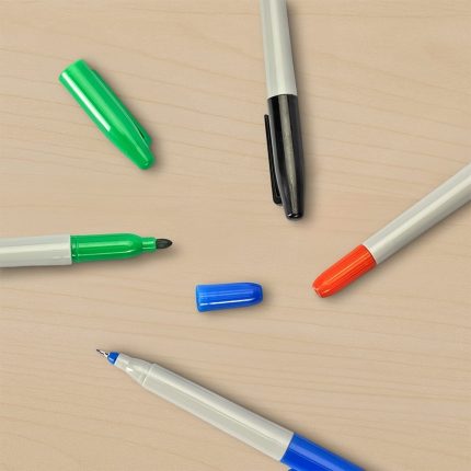 Descrição: Caneta marcadora plástica com ponta em formato de pincel. Possui tinta atóxica à base de óleo com solvente alcoólico.